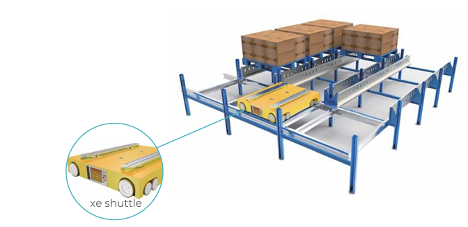 Xuất kho: Đây là quá trình xe shuttle di chuyển các pallet từ sâu bên trong kệ ra phía trước kệ, sau đó xe nâng sẽ lấy pallet hàng ra khỏi kệ.